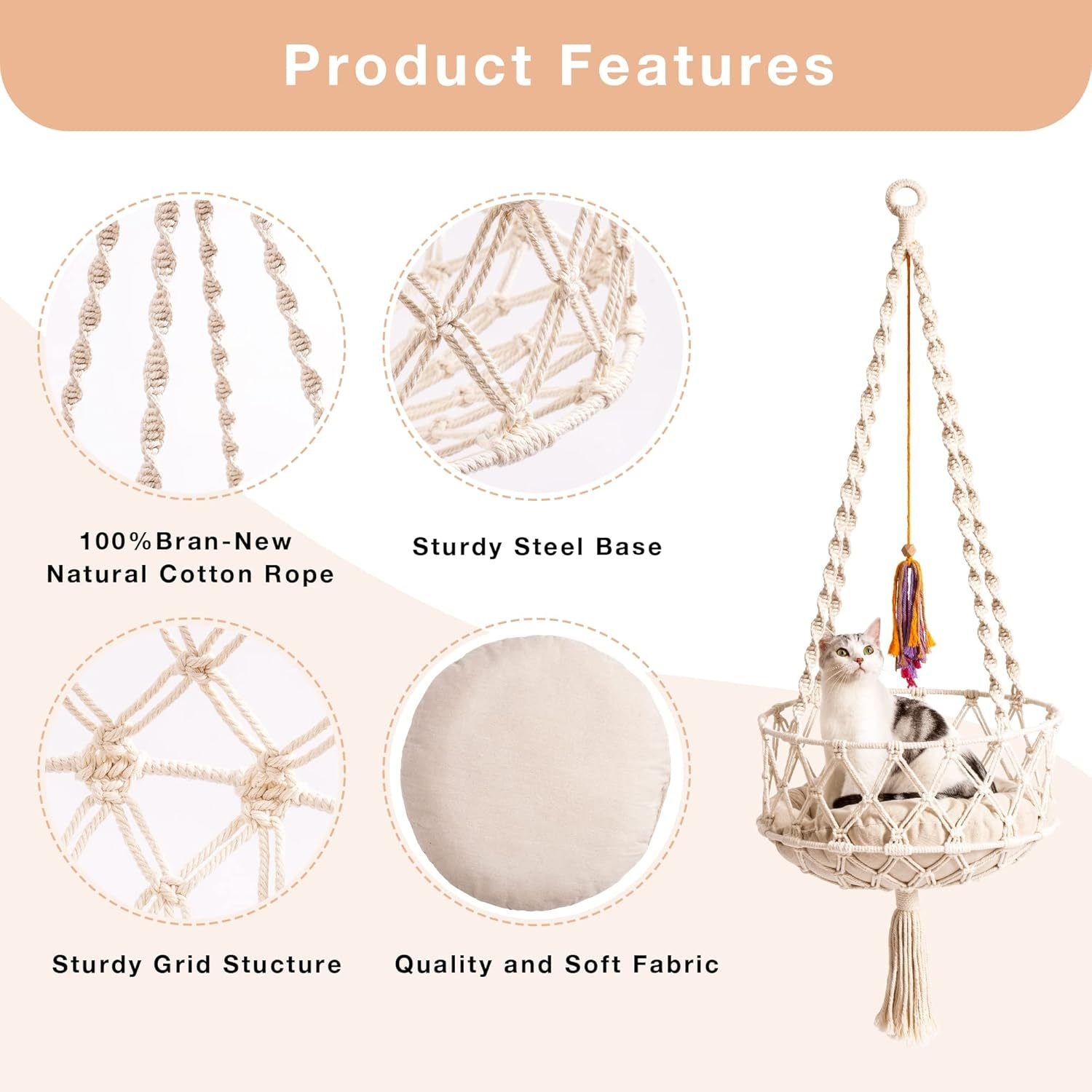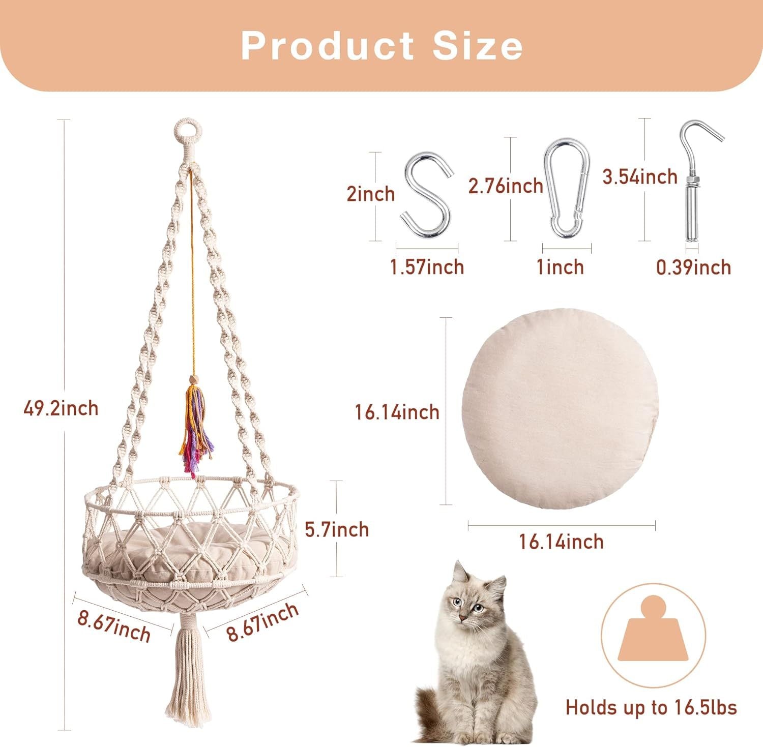 Sturdy: Boho macrame cat hammock bed is made of 100% natural high-quality cotton rope,the rope is thick and soft, with a long front and a short back, stable double steel hoop base, The bottom of the hanging cat bed is supported by a metal frame, it can keep balance and reduce swing, it's very safe for your cats.